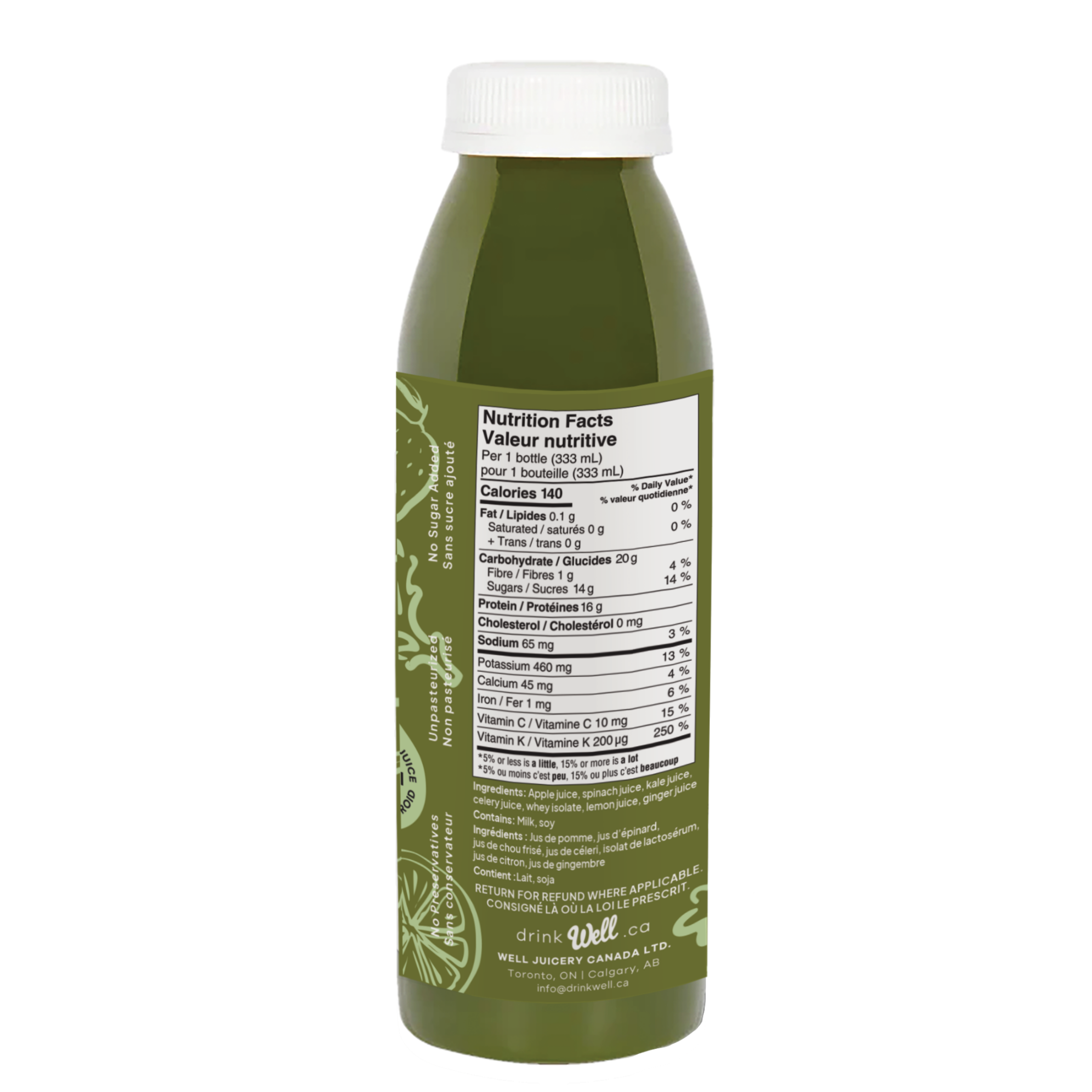 PWR Greens est notre jus vert le plus populaire, préparé avec des légumes-feuilles pressés à froid, des fruits frais et 16 g de protéines de lactosérum de haute qualité. Doux, rafraîchissant et nourrissant, il est parfait pour les matins pressés, après l’entraînement ou chaque fois que vous avez envie de quelque chose de sain et délicieux.